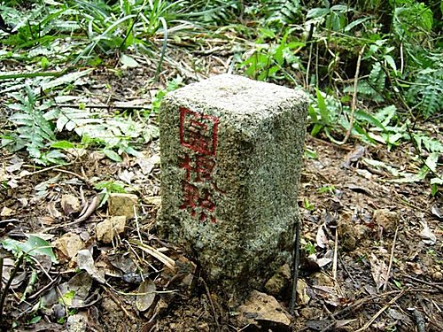 09:27退回瞭望台前方不遠處,決定先穿上雨褲,罩上雨套,取右進入柵欄叉路。一開始步道寬闊,以為好走,但還是要鑽樹洞、通過泥濘路。才幾分鐘左轉續行後,就開始無止盡的箭竹林尋尋覓覓之旅。一路濃密的箭竹林,其實林下都有路跡,只是寬闊原始的路段,令人不得不謹慎前進,唯恐迷失。砍路之餘,隨時注意前後方路條,被遮蔽的路條就整理一下,掉落的路條就拾起綁上,因為我們還要回來呀。小朋友經常就隱沒在箭竹林下,只見草動不見人影,讓人聯想到侏儸紀公園的迅猛龍在草叢中獵食的景象。小朋友走來雖辛苦,倒還會苦中作樂,沿途為各個重要據點取了站名,如水苔站、沼澤站、神木站、營地站等。11:10終於鑽出營地,一看資料還得再走上半小時才到。擔心午後雷陣雨,不敢稍歇,繼續鑽行箭竹林。11:47終於抵達多門山,標高2273公尺,三等三角點No.6329。去年南搜79天中央山脈大縱走的多門山等字跡,尚清楚的寫在三角點旁的一片石塊上。小朋友之前也看了好幾遍「中央山脈大縱走」節目,耳熟能詳,記得這是他們中央山脈縱走的起點(三星山、多門山),也覺得很興奮。